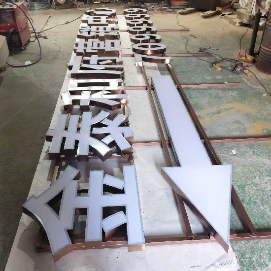正面為不銹鋼圍邊,面板為亞克力(透光板),字殼內安裝LED模組,背板為鋁塑板或PVC板。白天呈現(xiàn)不銹鋼金屬質感,夜晚均勻發(fā)光,標識清晰,性價比高,應用最廣泛。常用304不銹鋼,戶外或沿海地區(qū)建議使用316防銹性能更好的型號。厚度常見為0.8mm-1.2mm。